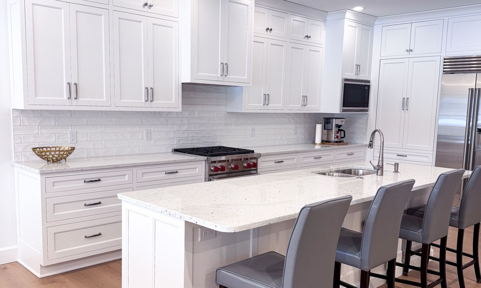 A beautiful lakeside setting is sure to attract friends and family, and this new JDM custom house builder’s showcase is ready for them all, from its handsome, solid wood front door to its big deck with a bench-style railing. The light-filled interior features multiple bay windows and a glass-enhanced cathedral wall. There’s room for a big dining table next to a massive fireplace, and a sparkling white kitchen with a farmhouse sink and a its own skylight. For the family and their lucky guests, this home welcomes everyone with open arms.