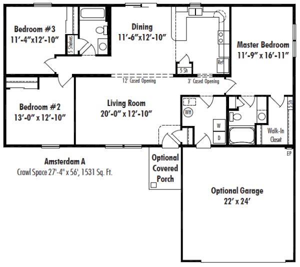 The Amsterdam model is a single-story modular home that provides all of the features standard to a permanent residence. This model features three bedrooms including a master suite. There are two bathrooms, with a master bath included in the suite. This prefab modular home has a total of 1,531 square feet, additional customization options for this model include porch customization, garage, and basement.